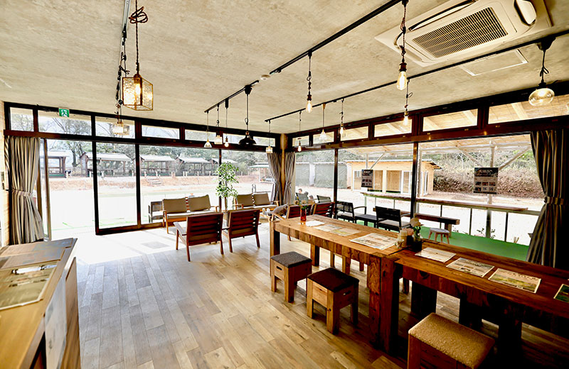 森に囲まれた静かな場所にあるカフェスペース。大きな窓から自然を感じながら、ゆったりとした時間を過ごせます。