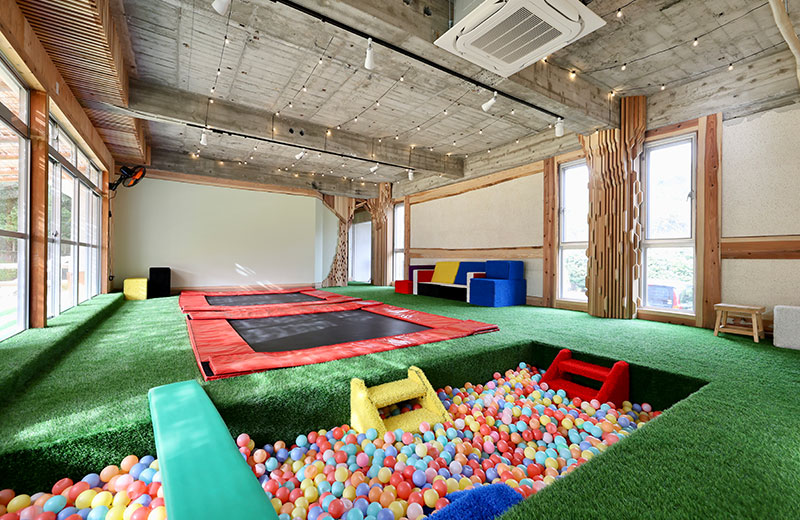 カフェに併設したキッズスペースで、くつろぎながら子どもたちが遊ぶ様子を見守れます。トランポリンやボールプールを備え、天候を気にせず家族みんなで快適に過ごせます。